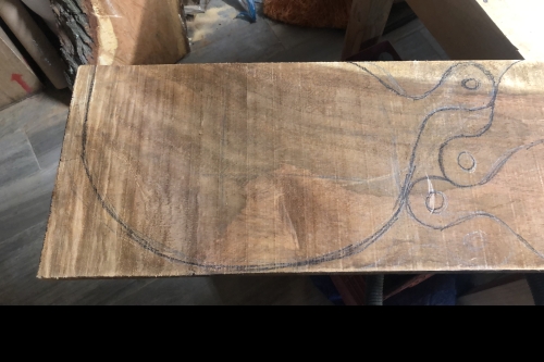 We draw the figure freehand, taking advantage of the knots and imperfections in the wood to make each piece unique.